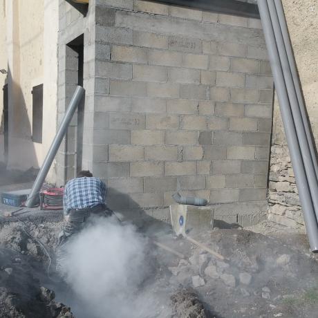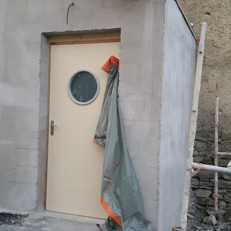 Intervention finale de l'Electricien de l'Entreprise RAYNE Jausiers, qui a procédé au branchement du chauffe-eau, de la résistance du sol et du thermostat de réglage qui a été intégré dans l'armoire électrique de la Salle des Fêtes et enfin le branchement de l'éclairage intérieur et extérieur, le tout temporisé.