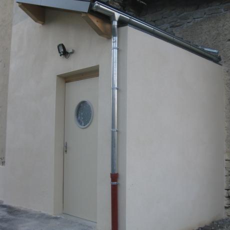 Jean-Louis, notre Agent Technique Communal, a procédé à la pose de la gouttière d'évacuation des eaux de pluies sous la toiture en bac acier et a procédé également au raccordement de la descente de gouttière au regard posé par ses soins antérieurement. Pour le moment le WC Public PMR est bien terminé mais tant que la ou ( les ) fuite (s) d'eau de la canalisation de la Salle des Fêtes n'est pas réparée, ce WC restera fermé à l'utilisation publique. Une Entreprise de la Vallée doit intervenir soit demain soit en début de semaine afin de procéder à la réparation de ces fuites et la création d'un nouveau système de raccordement au réseau d'eau qui passe à proximité de la parcelle de Joëlle, sous le WC ( ouverture d'une tranchée afin de passer la nouvelle canalisation qui sera posée à partir du WC avec un raccord dans la Salle des Fêtes en déconnectant l'ancienne canalisation défectueuse ). Jean-Louis interviendra également dans l'opération de raccordement de la nouvelle canalisation et il conviendra de faire venir VEOLIA afin d'effectuer la pose d'un compteur sur celle-ci.