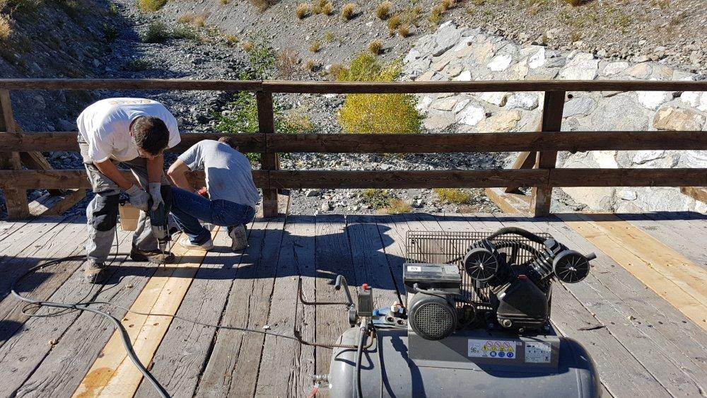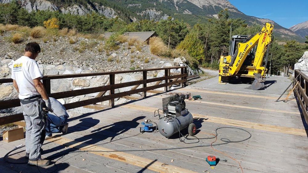 Remplacement du platelage du pont du torrent de FAUCON sur la Voie Communale 3 dont 6 bandes de bois du pont qui ont du être déposées et remplacées avec le changement de plus de 84 tirefonds et 30 à 40 vis.