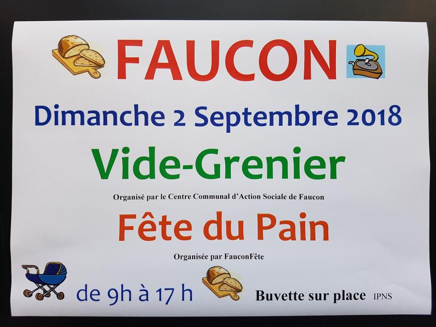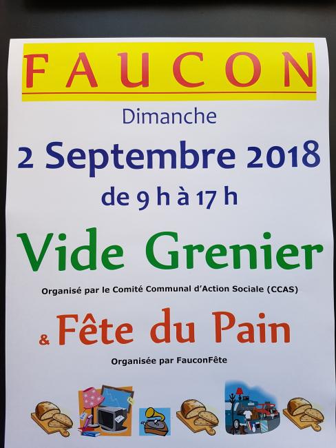 - 1° Vide-grenier organisé par le Centre Communal d'Action Sociale de FAUCON, au profit des oeuvres sociales de la Commune de Faucon, les places seront à réserver auprès du Secrétariat de la Mairie : Sylvie ou Rolande ou au téléphone : 04.92.81.14.24.