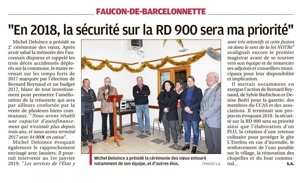 Initialement cette Cérémonie était programmée au Vendredi 12 Janvier 2018, mais le Maire a été contraint de reporter celle-ci au Dimanche 14 janvier 2018 à 18h, car le Préfet des Alpes de Haute Provence Mr Bernard GUERIN a programmé ses VOEUX 2018, le 12-01-2018 même jour et à la même heure que ceux de FAUCON initialement, ce qui aurait eu pour conséquence l'absence des Représentants des Services de l'Etat, ( dont notre nouvelle Sous-Préfète Carine ROUSEL qui vient de prendre ses fonctions le 3 Janvier dernier ), des Représentants des Corps Constitués, et de l'ensemble des Elus de tous niveaux de la Vallée de l'Ubaye.